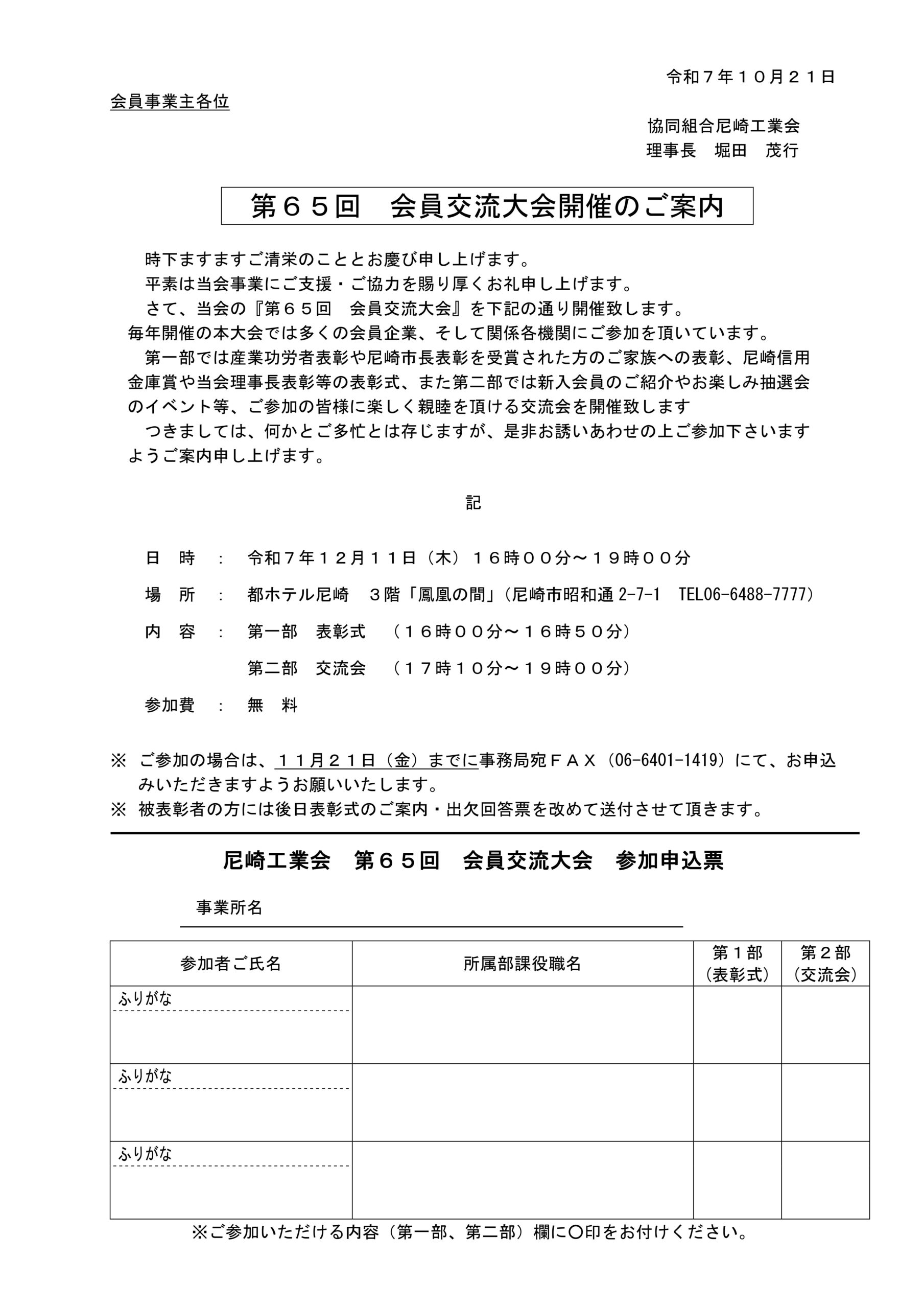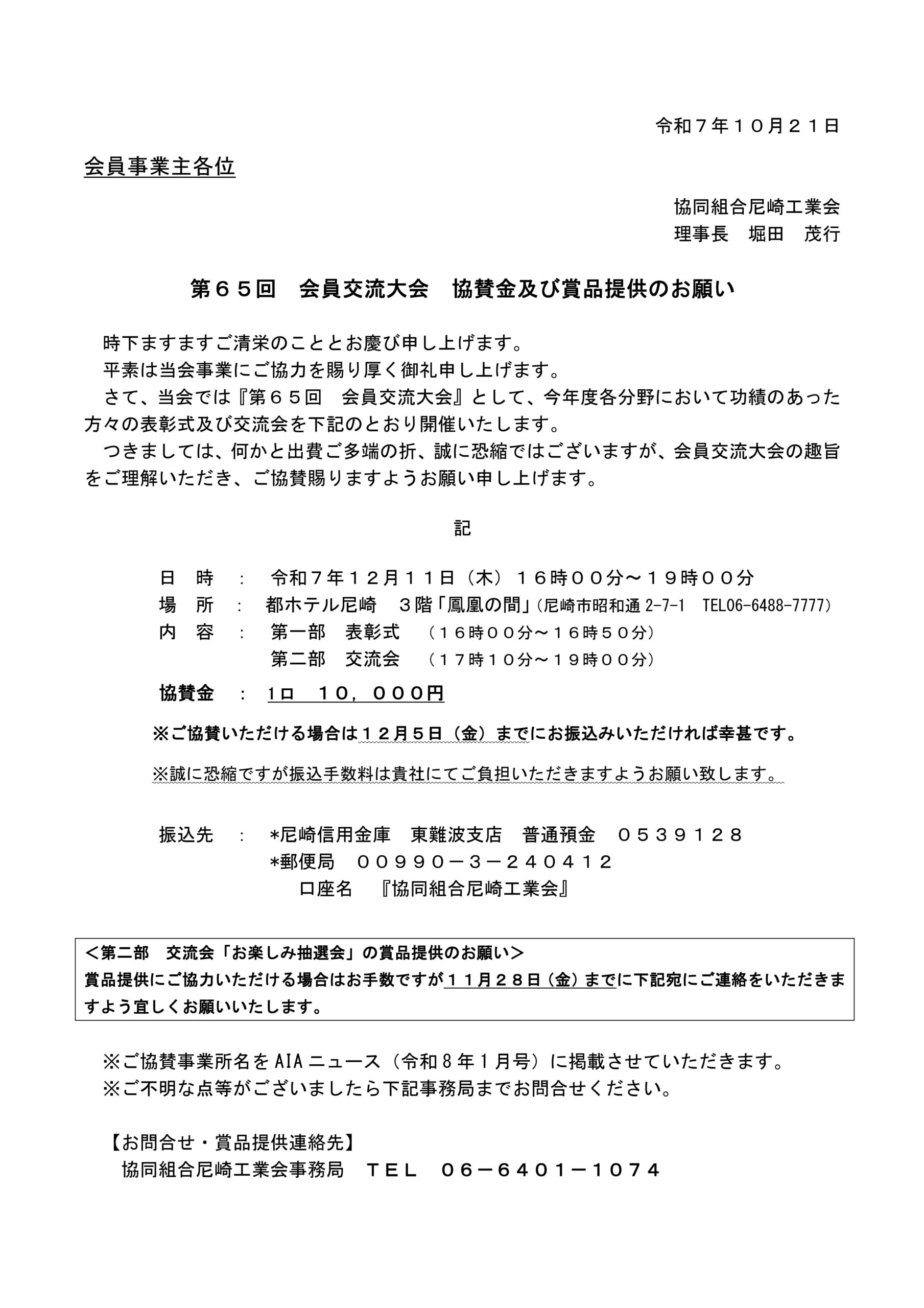 尼崎工業会 第65回会員交流大会(ご案内) 2025年11月01日 ◆案内・申込書はこちら → 第65回会員交流大会_開催案内(会員宛)================================発信 令和7年11月1日(土)協同組合尼崎工業会 事務局 この記事の Share はこちらから: Tweet « 前の記事へ │お知らせ一覧│ 次の記事へ » 関連記事 2024.2.15 【令和6年度】技能アカデミー年間一覧のご案内 2019.6.5 兵庫県立大学からのお知らせ 「金属新素材研究センター開設記念式典 ・セミナー開催について」 2022.1.11 尼崎産業フェア2022出展者募集のご案内 2024.1.17 (AMPI主催)2023年度オープンラボ「Win-Winを実現するオープンイノベーションの推進」(ご案内)