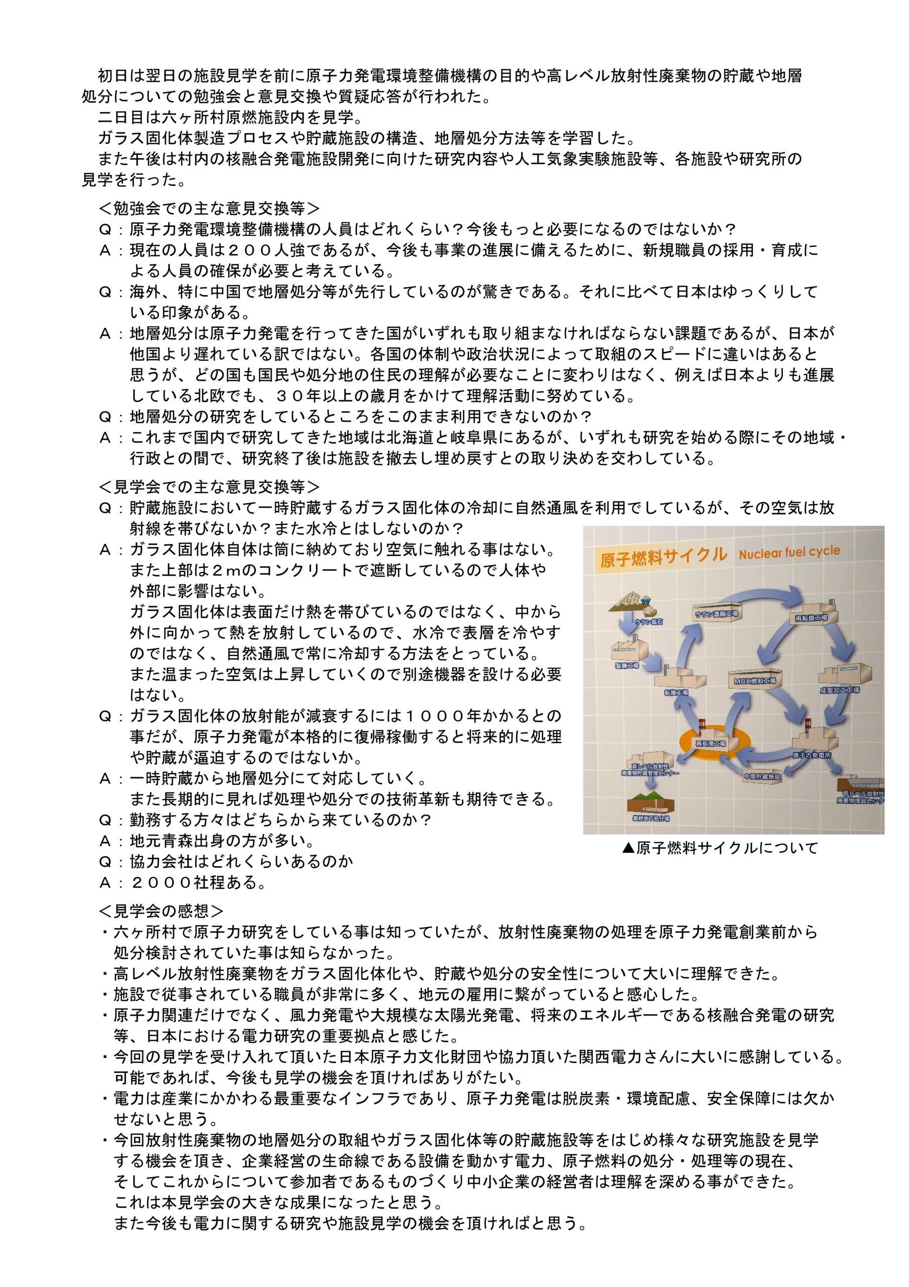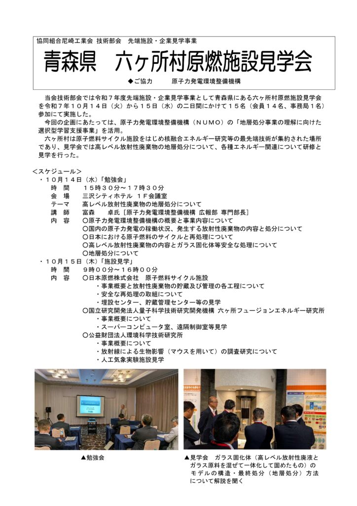 令和7年度技術部会 六ケ所村原燃施設見学会レポート 2026年01月09日 発信 令和8年1月9日(金) 尼崎工業会事務局 この記事の Share はこちらから: Tweet « 前の記事へ │お知らせ一覧│ 関連記事 2018.2.15 「経済産業省施策説明会 ~平成30年度支援メニューの説明~」開催のご案内 2025.7.10 兵庫県立大学㏌尼崎「大学と地域企業のつながりセミナー」のご案内 2020.6.18 【令和2年度】労働安全衛生研修会のご案内 2019.10.29 近畿高エネルギー加工技術研究所(AMPI)からの「オープンラボ”IoTの最新事情と導入事例”」ご案内