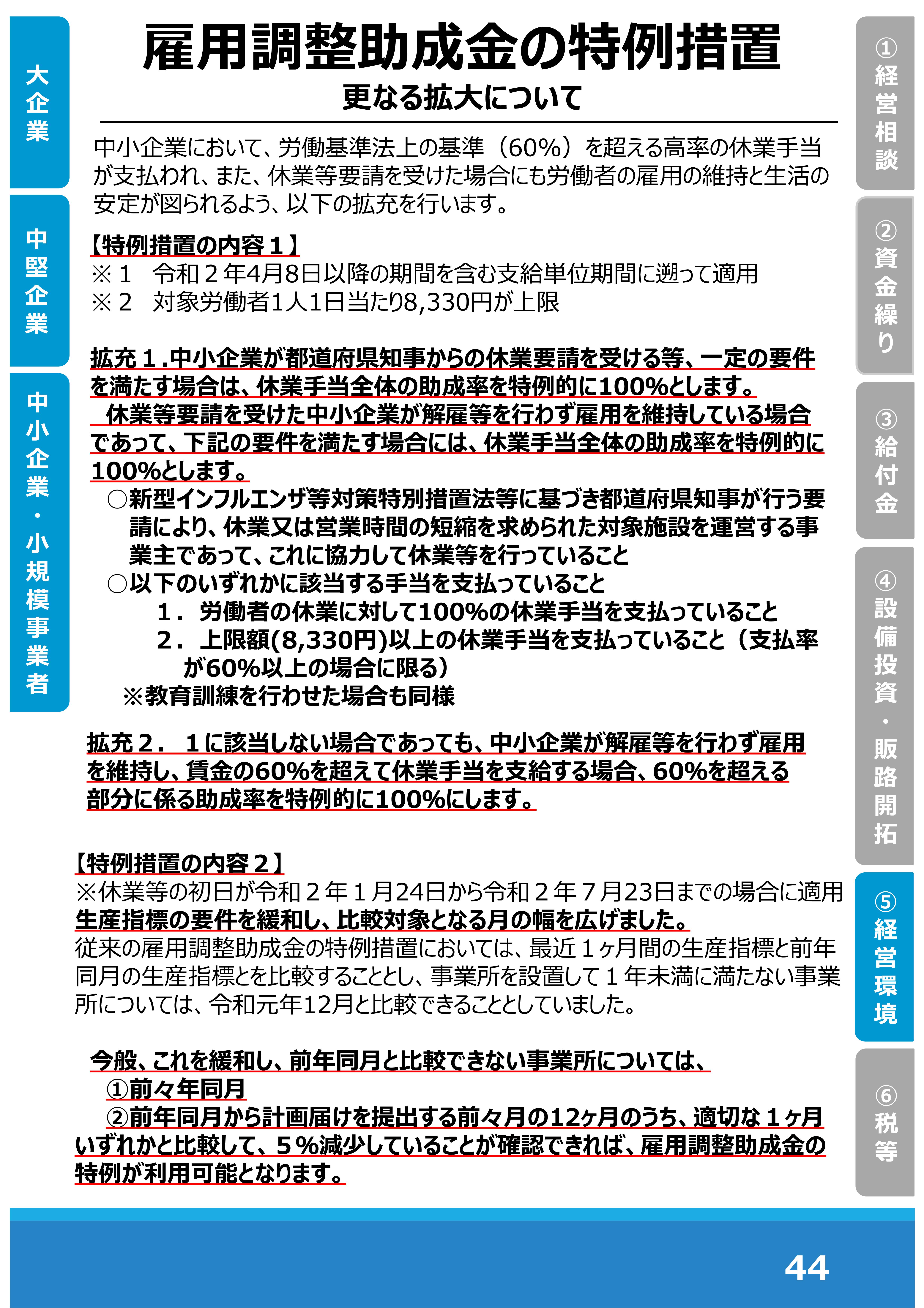 ・雇用調整助成金の特例措置の更なる拡大に関する情報を更新しました。(44ページ)